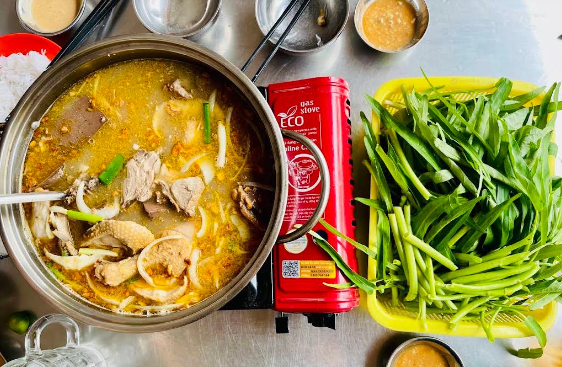 Lẩu vịt tại đây có nước dùng đậm đà, mùi chao vừa phải, không gây ngán. Thịt vịt được cắt miếng vừa ăn, mềm và thấm vị. Khoai môn và rau xanh ăn kèm giúp món ăn thêm tròn vị và dễ thưởng thức.