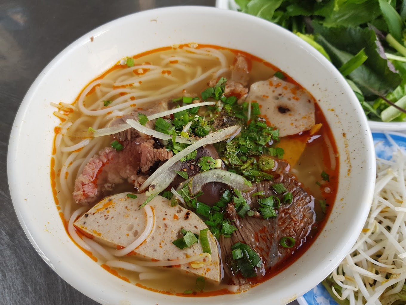 Tô bún bò ở đây phải chấm 10/10 vì vừa đậm chất Huế, vừa đầy ú ụ. Topping của bát bún siêu nhiều với thịt bò trần, viên chả cua to mềm, sườn, móng giò,… Chắc chắn sẽ khiến bạn no căng bụng luôn đấy.