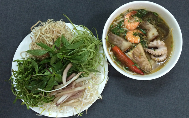 Tô bún mắm tại đây thường có tôm, mực, cá, heo quay và nhiều loại rau sống, tạo nên hương vị rất hấp dẫn.